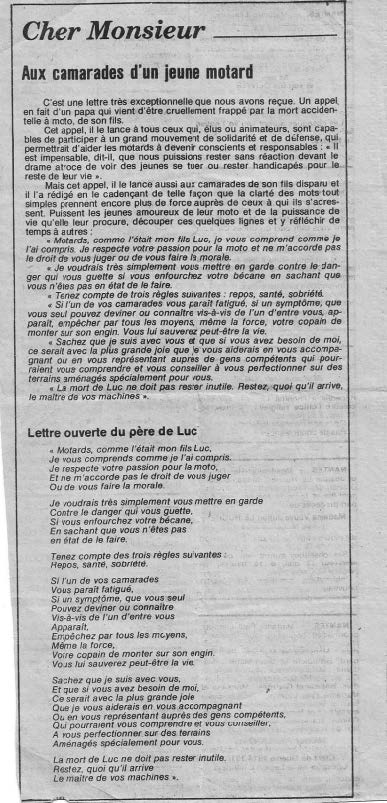 En 1981, Luc, alors tout jeune motard, disparaissait à l’âge de 18 ans. Dans sa lettre ouverte, son père, Claude, rappelait les trois règles élémentaires à respecter : « repos – santé – sobriété ». De ses trois mots naîtront l’état d’esprit de la CASIM et de cet appel dans la presse (voir ci-contre) naîtra l’association.